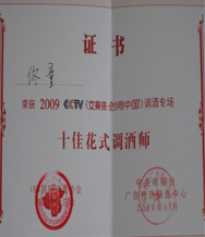 被《中央电视台》与《IBA国际调酒师协会》共同评为“中国十佳调酒师”的称号